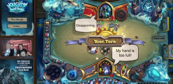 마지막 날에 공개되었는데 플레이도중 리치 왕이 죽음의 기사 카드를 계속 줘서 손패가 넘쳐나다가 하필 이 카드가 타버려서 난리가 났다. 운고로 메타때 이미 뒤졌는데 굴단은 또 뒤지냐는 설레발까지 나왔다.