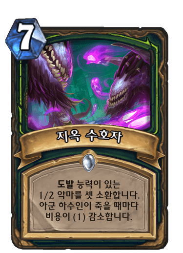 7코, 도발 능력이 있는 1/2 악마를 셋 소환합니다. 아군 하수인이 죽을 때마다 비용이 (1) 감소합니다.