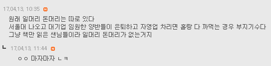 그러니까 비명문대는 학력빨 없이 성공한 사람들뿐이다. 제발 우리대학 어쩌구 하지 마라. 공무원 어쩌구 개소리 집어치워. 애싯기 소위 중위한테 굽실거리는 부사관 됐다고 그걸 갖고 부심 부리면 보는 내가 다 쪽팔린다.