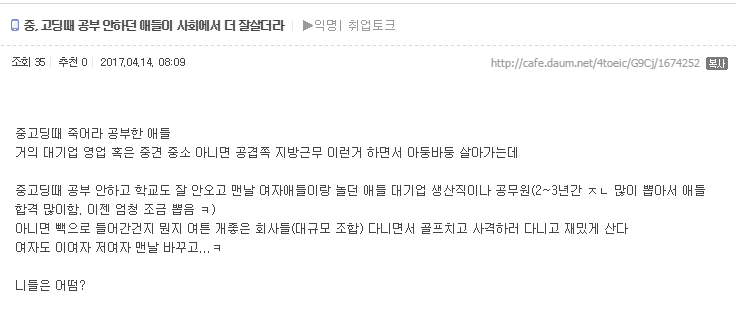 아니 애초에 공부 잘하는 새끼들이 머가리가 비어 있어서 느그들은 쳐다도 못 볼 영재교 특목고 자사고 들어간 줄 아냐? 일반고가서 상위권 충분히 갈 수도 있는 애들이 굳이 좋은 학교에서 바닥할려고 꾸역꾸역 몰려들어가던 걸 이미 고등학교 입시 시절에도 봤을텐데 대학교까지 가서 아직도 이따위 헛소리나 하는 걸 보고 있자면 이들이 왜 지잡대에 갔는지 알 수 있다.