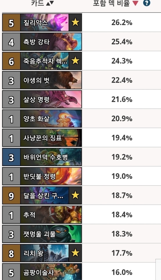 밸런스 패치 이후로는 도발떡대방밀전사도 타격을 입고 씹랄판이 되어서 채용률은 좀 떨어졌다만 40%로 여전히 1등이다.