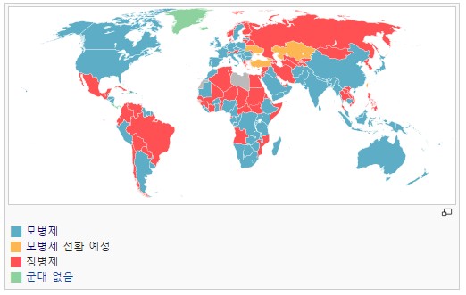 노란색 국가는 모병제 전환 예정인 국가 이다. 그렇다고 무조건 모병제로 바뀌는 게 확정은 아니고 결국 예정일 뿐이다.