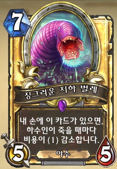 코볼트의 해골마라는 평가다. 둘다 어그로덱에 개나소나 쓰고 7코 5/5인것도 똑같다. 근데 지하벌레는 영웅 카드라 졸라비싸다.