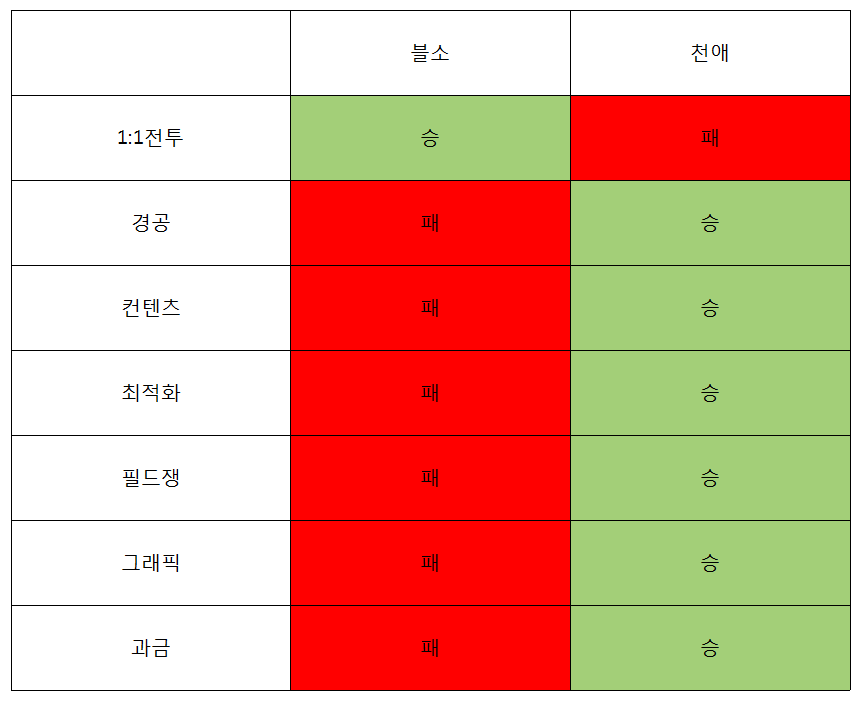 결론만 얘기하자면 천애가 압승이다. 일일이 글로 적기 번거로우니 짤방 하나로 대신한다