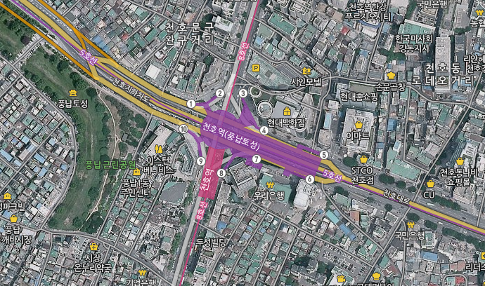 강동구 천호동과 송파구 풍납동 사이에 있는 지하철역. 나름 브이자구조(정확히는 ┌자 구조)로 열차칸만 신경써서타면 개념 환승이지만 출퇴근 때는 여전히 지옥이다. 그나마 잠실과 헬도림를 생각하면 양반.