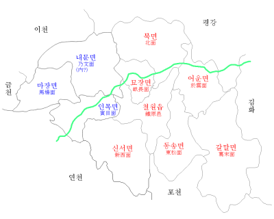 본래 삭녕군에 속했는데 1914년 철원군으로 옮겨졌다. 철원군지역중 유일하게 국군이 완전수복하는데 실패한 면이다.