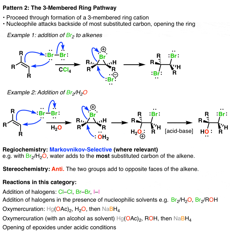2. 삼각-고리화 매개 첨가반응 : 먼저 붙는 작용기가 삼각형 양이온 ring 형성. 후진입 친핵체는 Markovnikov 선택성에 영향. 두 개의 작용기는 입체적으로 유리한 반대(trans, anti) 방향에서 접근.