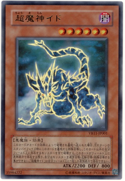 이 카드가 카드의 효과에 의해 파괴되어 묘지로 보내졌을 때, 다음 턴의 스텐바이 페이즈시에 이 카드를 묘지에서 특수 소환하고, 이 카드 이외의 자신 필드 위에 존재하는 몬스터를 전부 파괴한다. 이 카드가 필드 위에 앞면 표시로 존재하는 한, 자신은 몬스터를 통상 소환 / 반전 소환 / 특수 소환할 수 없다. "초마신 이도" 는 자신 필드 위에 1장밖에 앞면 표시로 존재할 수 없다.