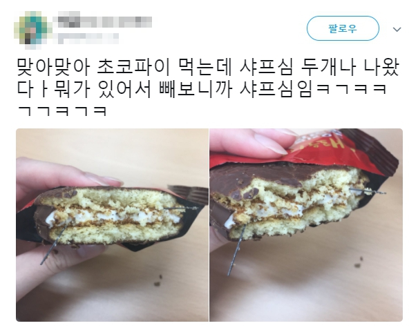 트위터에서 초코파이에 샤프심이 들어간다는 사실을 발견했다. 철사도 아닌 샤프심이 저렇게 완전하게 들어가다니 놀랍다.