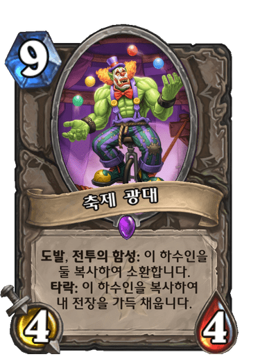 9코 4/4, 도발, 전투의 함성: 이 하수인을 둘 복사하여 소환합니다. 타락: 이 하수인을 복사하여 내 전장을 가득 채웁니다.