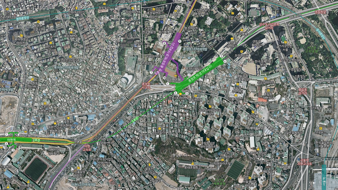 2호선은 아현역이랑 충정로역을 합쳐서, 5호선은 애오개역과 충정로역을 합쳐서 서로 아현교차로에 역 만들었으면 개념환승이었을텐데