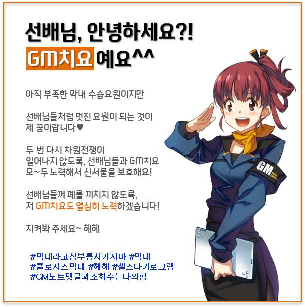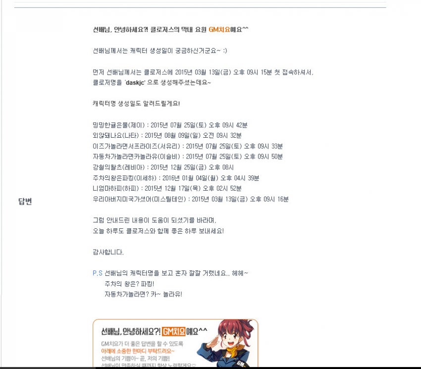 - 2015년 추석 이벤트로 제공된 기간제 송편을 영구 보관되는 것으로 착각하여 문의 답변을 해주었다. 자세한 정황은 이곳[4]으로. 이 사건의 팬만화도 공홈에 올라왔다. [5] 그리고 클로저스 갤러리에서는 이 사건 이후 이런[6] 글이 개념글로 올라가는 등 치요의 인기가 급상승 하였다. 이후 얻은 별명이 겜알못.[7] 사건 직후 쓴 GM노트 첫 부분에 소소한 심정 고백이 있다. 투명 글씨로 몰래 쓴 말도 있으니 드래그 해서 봐라.