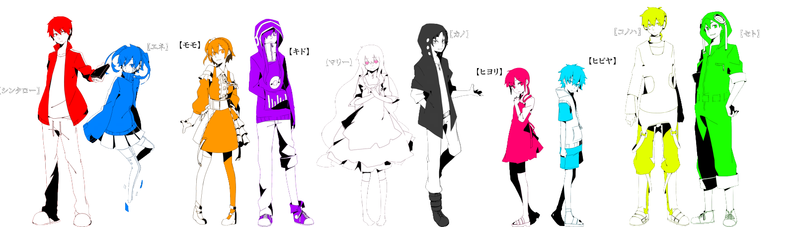 왼쪽부터 신타로, 에네, 모모, 키도, 마리, 카노, 히요리, 히비야, 코노하, 세토