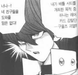 Quiet you sniveling sycophants. It's true, I went through a great deal of trouble to recreate the Pharaoh's deck, his strategies, even his perfectly coiffed hair. In fact, that part is what took the longest. (닥쳐라 이 징징대는 아첨꾼놈들.어둠의 유희 덱 전략을 다시 만드는데 큰 곤란을 겪었는건 사실이였고 심지어 그 녀석의 완벽하게 손질한 머리카락까지 실현시켰지.실은 그 부분(머리카락)이 가장 오래 걸렸다.) |