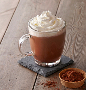 주 재료는 초콜릿 시럽 2번, 투샷, 스티밍한 우유, 휘핑크림이다.