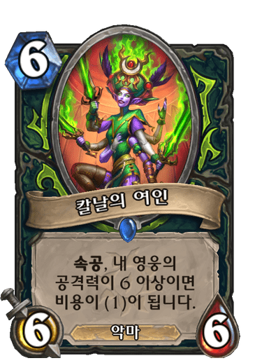 6코 6/6 악마, 속공, 내 영웅의 공격력이 6 이상이면 비용이 (1)이 됩니다.