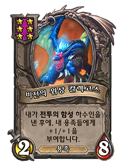 4/12 (8/24) 용족, 내가 전투의 함성 하수인을 낸 후에, 내 용족들에게 +1/+1 (+2/+2)을 부여합니다.