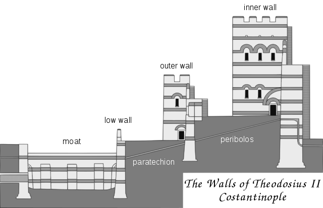 콘스틴타노플은 육로로 되어있는 부분이 약 6km정도되는데 이곳을 둘러친 성벽이 3개로 되어있어 3중성벽으로 불리운다. 그러나 해안가지방은 1개로만 되어있지만 비잔틴 제국은 이곳에 상시 재해권을 유지했기에 문제는 없었다.