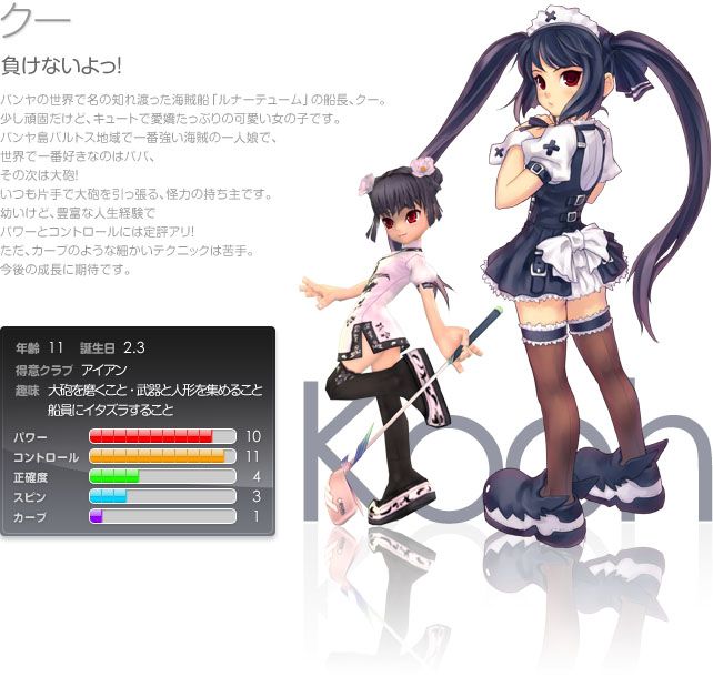 팡야의 캐릭터로 나이가 11세로 넬이 등장하기 전까지는 가장 연소자였다. 생일은 2월 3일.