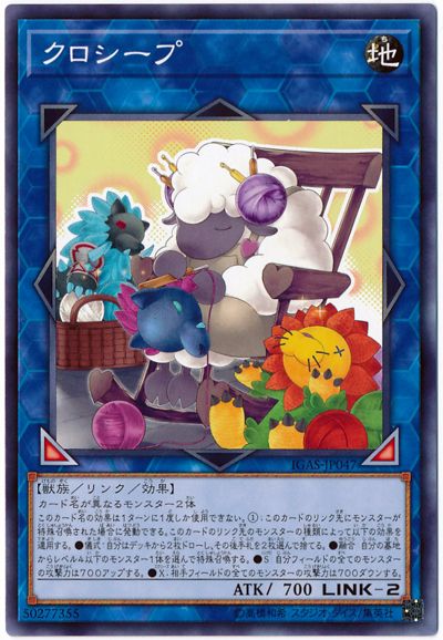 카드명이 다른 몬스터 2장 이 카드명의 효과는 1턴에 1번밖에 사용할 수 없다. ①: 이 카드의 링크 앞에 몬스터가 특수 소환되었을 경우에 발동할 수 있다. 이 카드의 링크 앞의 몬스터 종류에 따라 이하의 효과를 적용한다. ●의식: 자신은 덱에서 2장 드로우하고, 그 후 패를 2장 골라 버린다. ●융합: 자신 묘지에서 레벨 4 이하의 몬스터 1장을 골라 특수 소환한다. ●싱크로: 자신 필드의 모든 몬스터의 공격력은 700 올린다. ●엑시즈: 상대 필드의 모든 몬스터의 공격력은 700 내린다.