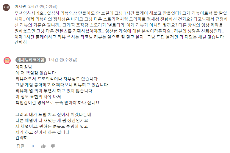 어차피 저 영상 보는 사람들은 쟤가 겜 리뷰어인지 모를 가능성이 높다. 여담으로 타코부계정은 영상을 다 올렸는데 본계는 전부 비공처리함.(올해 올린 사과 영상제외)