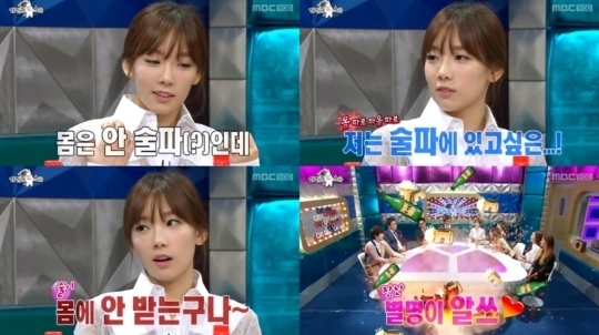 자신을 알쓰라고 부를 만큼 태연은 술을 잘 못마신다고 한다.[13]