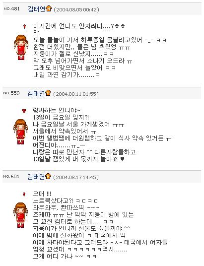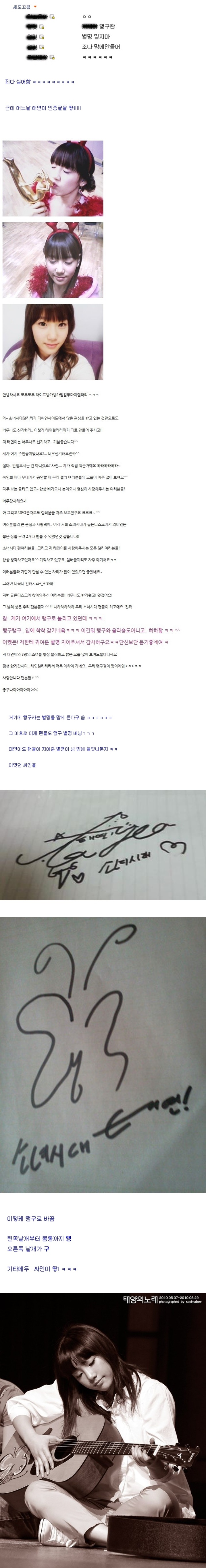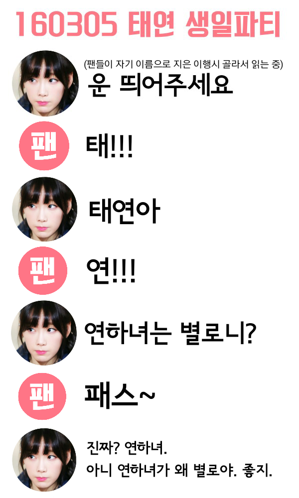 - ↑ 디시 특성도 있지만 소녀시대 멤버 갤러리들이 그렇듯이 태연 갤러리도 다른 아이돌 이름 필터링 따위는 개나 줘버린 탓도 조금 있다.