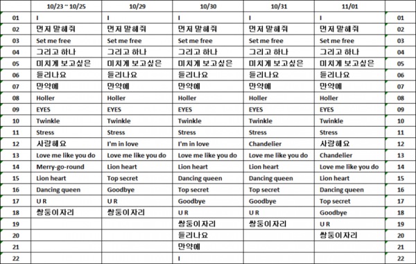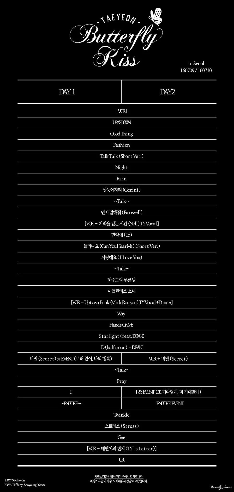- ↑ 딘 혼자서 D도 불러서 팬들의 떼창을 유도했지만 안타깝게도 덕후들이 태연 노래밖에 잘 몰라서 떼창은 불가했다. 그러나 호응은 좋았다!