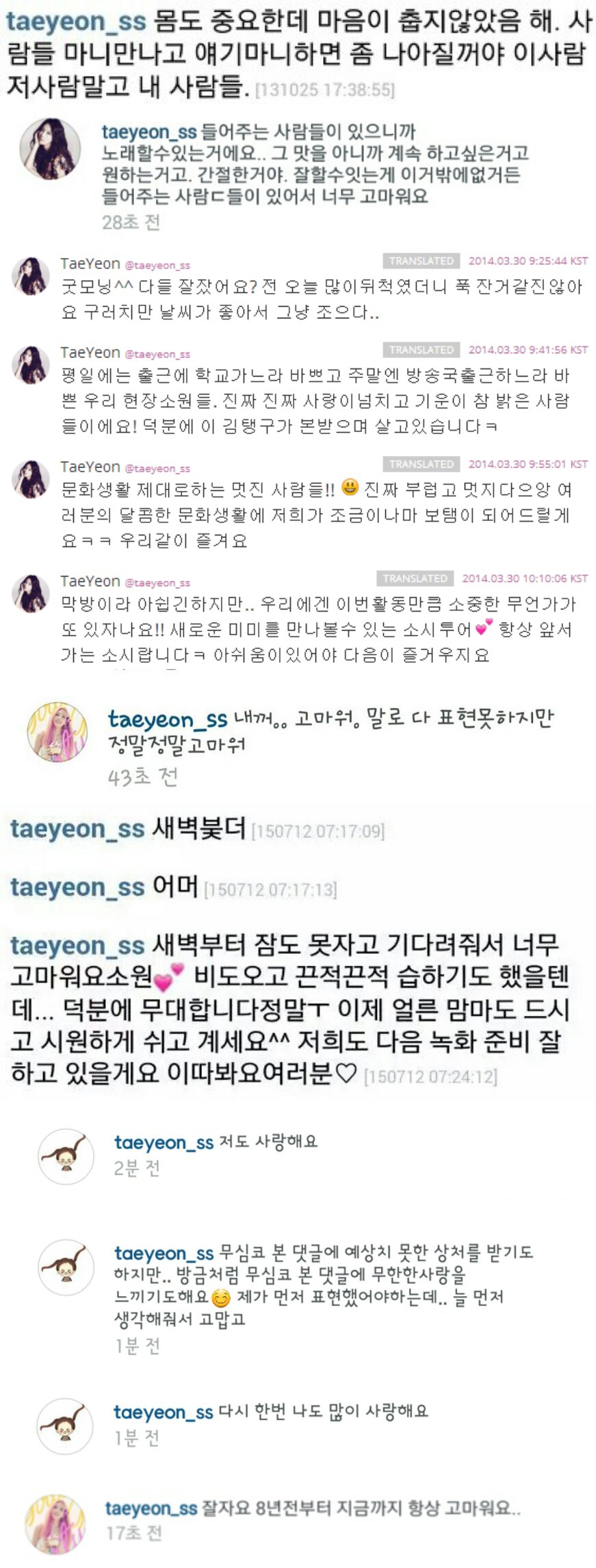 - ↑ 일례로 2011년 즈음인가 태연이 팬들한테 앞으로 더 다가가겠다고 말했던 적이 있었는데 정말로 그 후로 팬들에게 더 가깝게 대해주기 시작. 2014~2015년에 들어서는 전보다도 더 팬들에게 표현을 자주, 풍부하게 해주는 것 같다. 그때 쯤에 한 인터뷰들이나 말들을 들어보면 본인이 스스로 뭔가 더 표현하기 위해 노력하기 시작한 느낌. 주변인들의 말을 들어보면 원래 감정 표현이 조금은 서툰 사람이라서 본인도 그것을 알고 많이 노력하는 것 같다. 물론 전지적 덕후 시점 궁예이니 적당히 가려서 듣자.