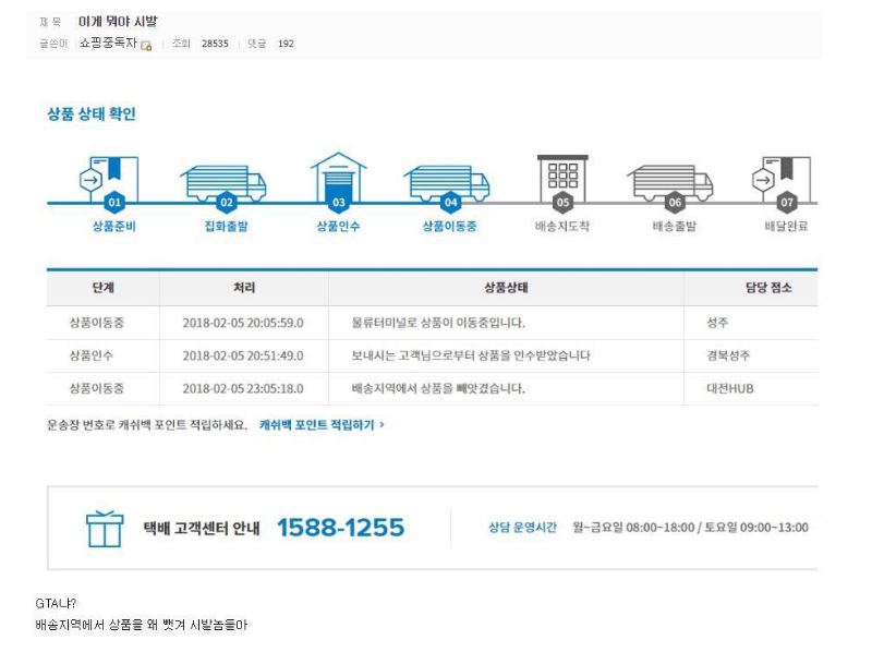 그래서 소비자 고발센터에 전화하니 대답은 좃데택배는 원래그래서 자기들도 어떻게 못한다는 대답만 돌아옴 ㅋㅋㅋㅋㅋㅋㅋㅋㅋㅋㅋㅋㅋ야이씨발련들아 말이냐막걸리냐