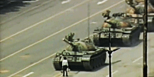 줄지어 진격하는 탱크 앞에서 탱크가 더이상 지나가기 힘들게 유도했는데 이 장면은 cnn에 그대로 보도되면서 천안문 사건당시의 중국 정부의 무력 진압을 알리는 계기가 되었다.