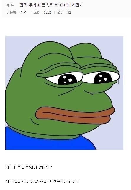 뇌가 자극속에 든 우리라면? 그리고 어떤 미친 과학자가 그 거기 속에 통을 주고있는 거라면? 통이 과학자속에 든 거기라면? 그리고 어떤 미친 우리가 그 뇌 속에 자극을 주고있는 거라면? 자극이 뇌속에 든 우리라면? 그리고 어떤 미친 거기가 그 통 속에 과학자를 주고있는 거라면? 과학자가 뇌속에 든 통이라면? 그리고 어떤 미친 자극이 그 거기 속에 우리를 주고있는 거라면? 과학자가 뇌속에 든 우리라면? 그리고 어떤 미친 자극이 그 거기 속에 통을 주고있는 거라면? 자극이 우리속에 든 통이라면? 그리고 어떤 미친 거기가 그 과학자 속에 뇌를 주고있는 거라면?