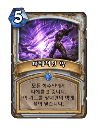 5코에 3뎀 전체 광역피해를 준뒤 상대 덱에 그 카드를 쳐넣어 드로우를 방해한다. 상대가 뽑아서 쓸러고 하면 사제 하수인들 피가 높아서 별 쓸모가 없다.