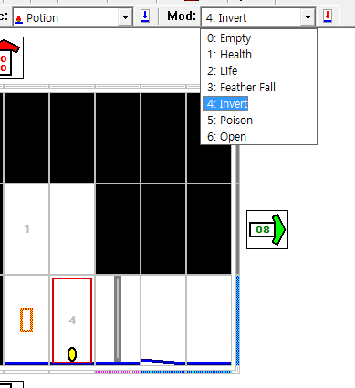 "Mod"는 그 타일의 상태(또는 종류)를 고르는 타입으로 오브젝트에 따라 다르며 기본 상태는 0:으로 고정되있다. 예를 들어 Tile 물약(Potion)은 Mod가 0:맹물, 1:회복, 2:1UP, 3:무중력, 4:화면 뒤집기, 5:독, 6:오픈으로 되어 있어서 Mod를 3:Feather Fall로하면 (단축키는 숫자키 3)그 물약은 무중력 약이 되는 것이고, 5:Poison로 지정하면 독약이 되는 것이다. 이렇게 물약의 '종류'를 바꿀 수 있다.