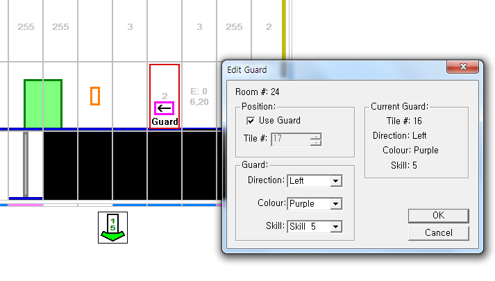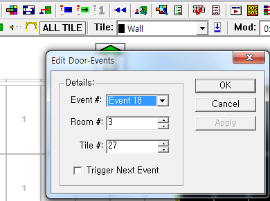 어떤 Event가 어떤 장소를 지정하도록 기능을 주려면 툴바에서 소개한 도어 이벤트 정의(Door-Event Definition)에서 특정 이벤트를 넣어주면 된다. 그림에서 room을 7로, tile을 26으로 바꿔주면 event 18은 대상이 7번 방의 26번째 타일로 바뀌며, Mod가 18인 발판들은 7번방 26번째 타일에 있는 문을 열어준다.