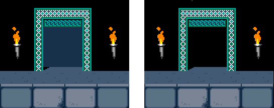 다른 스테이지로 가는 문(Exit)을 지정할 때는 주의해야할 것이 2가지 있다. 첫 번째는, 일단 Exit는 Left Half와 Right Half로 나뉘어져 있어서 두 개를 갖다붙여야 문이 완성되는데, Door-Event는 그 두 짝의 문 중 무조건 왼쪽(Exit Left Half)을 지정해야줘야 한다는 것. 두 번째는 왕자가 시작하는 방에 있는 Exit는 열려도 못 들어간다. 열리면 아래처럼 나옴. 정상적으로 클리어하게 하려면 시작 위치와 들어가는 문은 서로 다른 방에 있어야 한다.