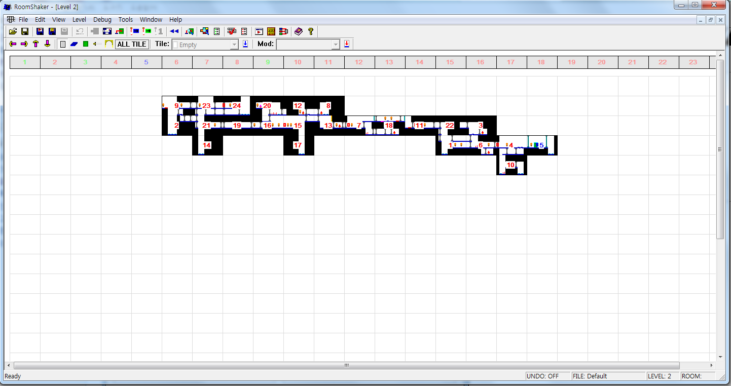 맨 처음에 나오는 맵의 전체 모습이다(오리지날 Level 2). 그림에 보이는 네모 박스 하나하나를 방(Room)이라 부르고 최대 24개까지 이어붙일 수 있다. 어떤 식으로 이어붙이느냐에 따라서도 다양한 모습으로 꾸밀 수 있다. 아예 새로운 맵을 만들고 싶으면 Tools > Clear Entire Level을 해주면 된다.
