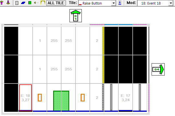 내가 설치한 버튼이 어떤 장소에 있는 문을 열도록 설정하고 싶으면, 버튼 Mod에서 적절한 Event를 골라서 선택해주면 된다. 그림에서 E:18 3,27이라 쓰여있는데 이것은 현재 이 버튼의 Mod가 Event 18에 맞춰져 있으며, Event 18은 3번 방의 27번째 타일을 지정하는 기능을 갖고 있다는 의미를 지니고 있다. 즉, 저 발판(raise Button)을 누르면 3번방 27번째 타일에 있는 문이 열리게 된다. 반대로 저 발판을 닫히는 발판(Drop Button)으로 바꿔주면 문은 닫히게 된다.