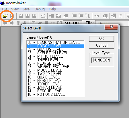 - 니가 디자인 하고픈 레벨을 찾아서 열어라. 왼쪽 위에 폴더 모양 툴을 누르면 가운데와 같은 창이 뜬다. 0탄은 데모버전, 1탄부터 12탄은 굳이 말 안해도 되겠고, 13탄은 자파랑 떡치는 데, 14탄은 공주년이랑 떡치는 스테이지다. 선택하고 OK 눌러라.