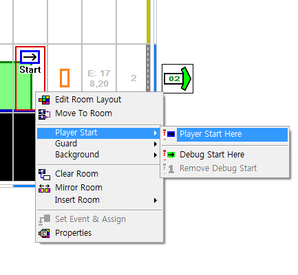 툴바에 있는 시작 위치를 누르고 원하는 좌표를 찍거나, 개별 룸 편집 단계에서 우클릭 > Player Start를 클릭하면 된다. 디버그도 마찬가지.