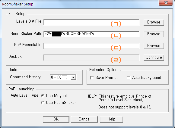 (ㄷ) 굳이 안 해도 된다. 니가 에디트 중인 페르시아 왕자 실행 파일(prince.exe)을 지정하는 건데, 이거 설정하면 일일히 폴더 안 찾아가도 룸 쉐이커에서 바로바로 켜서 테스트 가능.