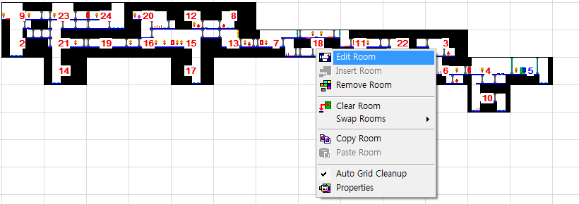 각각의 룸을 오른쪽 클릭 해보면 여러 가지가 나오는데, 직접 Room 안을 디자인 하려면 Edit Room을 누르거나 툴바에 있는 에디트할 맵 선택(Edit Room)을 누른 뒤 번호를 적는다.