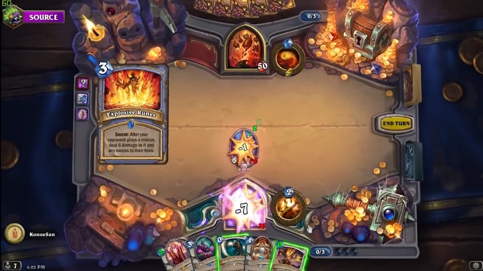 3코, 상대편이 하수인을 내면 그 하수인에게 피해를 6 주고 남는 데미지는 상대 명치에 들어간다.