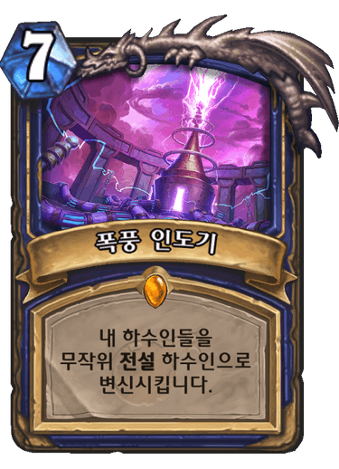 사령술사 스랄이나 야레기통으로 간 진화 비스무리하게 광역으로 변신시키는 주문이 나왔다. 이 카드는 대상 하수인의 코스트 관계 없이 순수 운빨로 변신시키에 값비싼 7코로 나왔다.