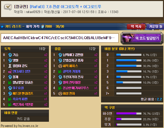 도저히 쉴드가 불가능한 100% 무뇌덱이다. 지금까지 도적덱들이 그래왔듯 실력 따위는 필요 없이 티비보면서 클릭클릭해서 등수올리기 좋은 덱이다.