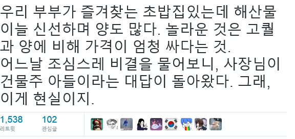 윗짤은 초밥집을 말하는거지만 일반 음식점의 질이 떨어지는 이유는 한국은 선진국에 비해 내수가 엉망인점에도 기여한다.