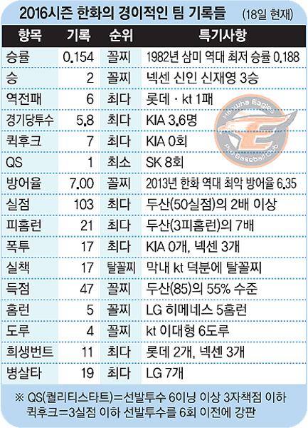 - 한화 이글스, 빙그레 첫 해 이후 최소경기인 '42경기 만에 30패' 굴욕