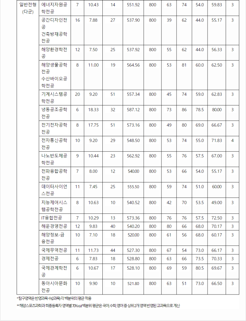 냉동공조공학과는 전국에 4개(부경대 한해대 전남대여수캠 동명대)만 가지고 있는 특수학과로 부경대와 해양대가 전국 냉동공조 업계의 원탑을 차지하고 있다 해운경영학과는 80년도 생긴 최초일반학과로 전국유일 해운경영학과로 해운업계와 부산금융공기업에 진출하며, 부산대 경영다음의 위상을 자랑하고있다.(해운업계에선 그보다 더 높다) 해사법학부는 전국 유일 해사법학으로 법학과에서 높은 위상을 자랑하고 있다. it융합공학과는 일반 컴퓨터공학과로 높은 취업율을 자랑하고있다. 전기전자공학과는 일반 전기공학과로 높은 취업율을 자랑하고 있다.(공대 아웃풋 원탑) 전자통신공학과는 일반 전자공학과로 높은 취업율을 자랑하고 있다.(공대 아웃풋 원탑) 기계시스템공학과는 일반 기계공학과로 높은 취업율을 자랑하고 있다. 나노반도체공학과는 2023년 계약학과로 떡상한 학과이다. 일반 소재 재료공학과이다. 조선해양시스템공학과는 전국 4위 조선공학과로 높은 취업율을 자랑하고 있다. <2022 한국해양대 정시입결> 1.냉동공조공학 평백 80 2.항해융합 평백 76 3.it융합 평백 72 4.전자통신공학 평백 71 5.전기전자 평백 67 6.나노반도체 평백 66 7.기계시스템 평백 62 -여기까지가 이과기준 평백 60~80인 항해+일반대상위학과- 실제로 전화기컴 냉동공조 인아풋둘다 좋은 학과들임 문과는 해운경영 해사법 좋지만 문이과는 구별해야되서 기입안했음 기관은 나와있다시피 평백 39다 모집인원이 아무리 많다해도 항해는 평백 76찍히는데 기관이 왜 이런지는 니 스스로 생각을 해봐라 오지말란데는 다 이유가 있다. 이상 정리하자면 위 상위 7개학과+물류시스템,조선해양시스템,해운경영,해사법,해사인공지능은 엄연히컴공학과니 이거까지 넣어서 12개학과를 제외하곤 왠만하면 동아대 갈바엔 오는건 환영이지만 기관은 정말 잘생각해보고 동아대 기계 vs 해양대 기관이면 그냥 동아대를 가라 해사대는 한학기에 170만원 기성회비도 내야되고 공짜도 아닌데 170이면 동아대도 6분위 기준 전장받으면 그쯤 내는걸로 알고있다. 무조건 걍 동아대 기계를 가라 군대뺄려다 인생을 40~50도 기관실의뱃노예로 살아야될수도있다. 물론 항해는 제외다 항해는 부산대 문사철 갈바에 여기오는게 정말 현명한거다.