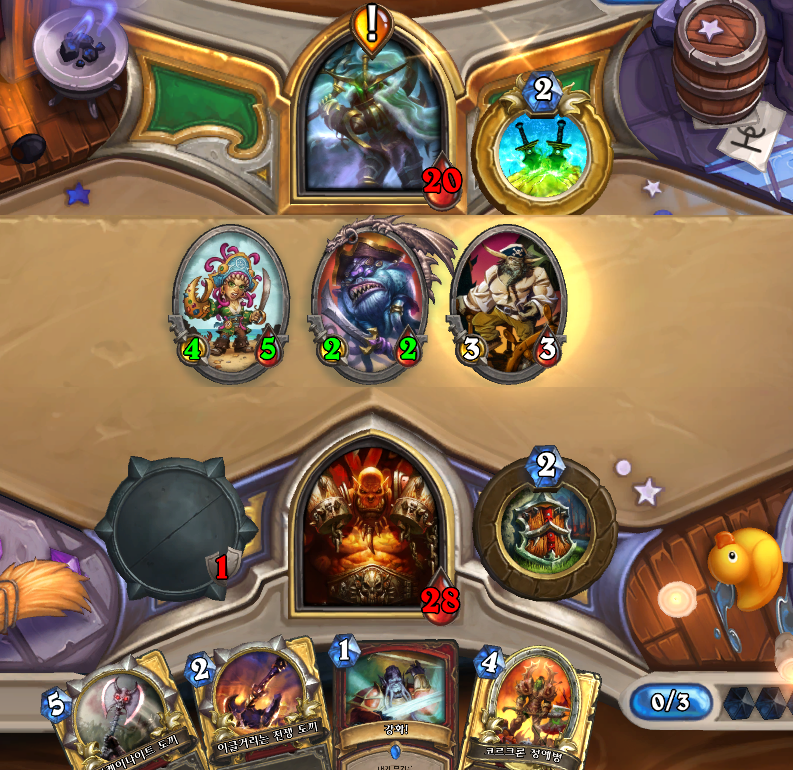 신참 해적단원 : 내가 무기를 끼고 있으면 공격력+2 화염임프가 되는 씹사기카드. 하지만 생명력이 1이 되는 너프를 먹고 사망했다.