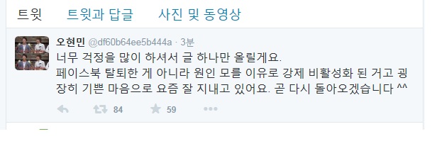 오현민 : 트위터에 "요즘 굉장히 기쁜 마음으로 지낸다" 글 씀